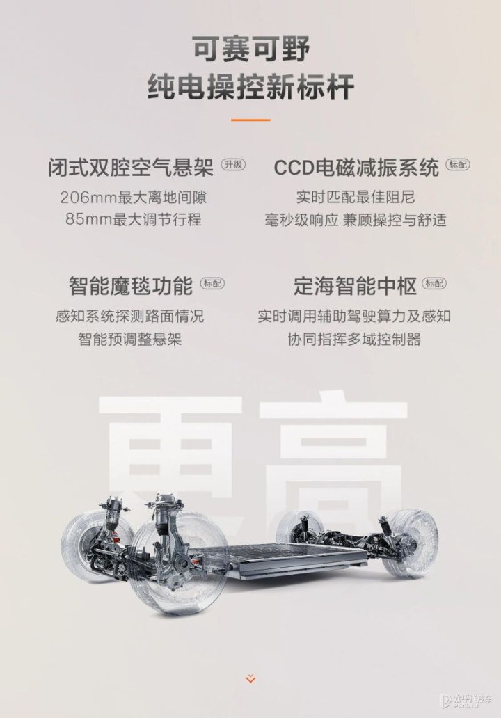 底盘方面,新款极氪001采用前双叉臂式后五连杆式独立悬架的形式,并升级闭式双腔空气悬架,最大可实现85毫米的高度调节行程,以及配备CCD电磁减振系统和智能魔毯功能。