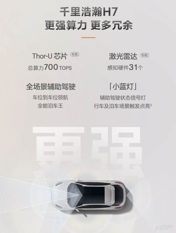 在辅助驾驶方面,新款极氪001全系标配千里浩瀚H7辅助驾驶系统,搭载英伟达Thor-U芯片(算力700TOPS),并配备一颗激光雷达在内共31个感知硬件,可实现高速/城市领航辅助驾驶、智能泊车等功能。